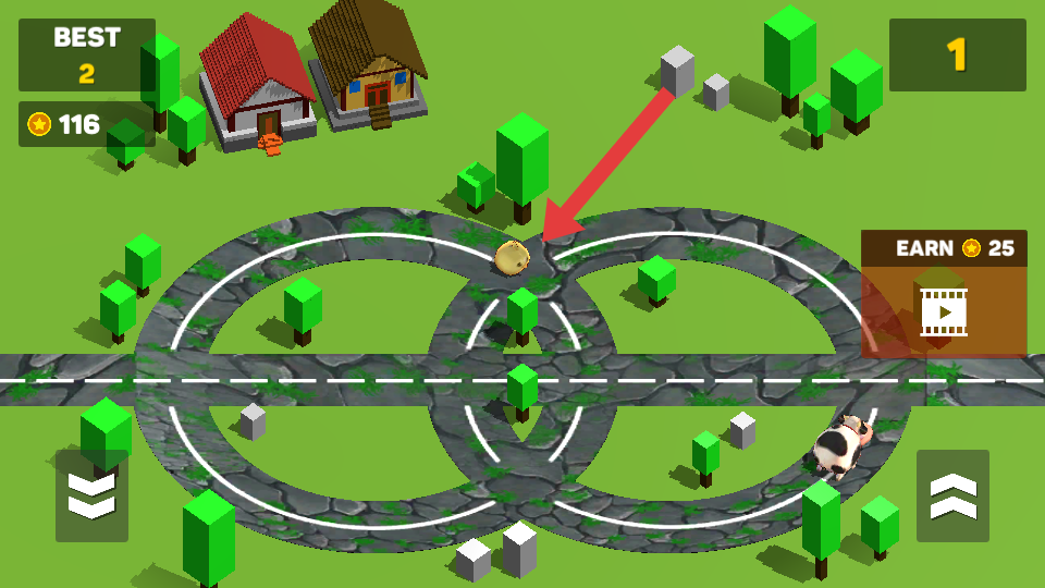 3、解锁绿色的森林的赛道第三关后,同理来操控新角色如奶牛等等,绕环形路收集金币与道具,躲避房屋。
