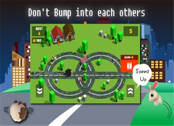1、调节速度避碰撞:让动物在圆环里跑动,通过点击按钮提升或降低速度,躲避其他动物,避免撞到城市中乱跑的动物,确保所选动物安全的奔跑。