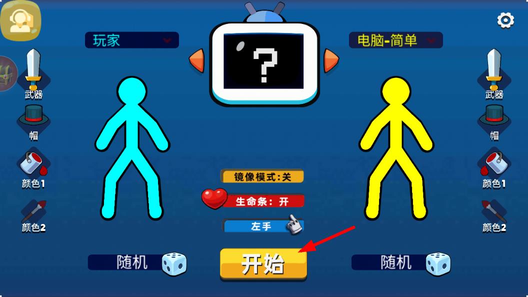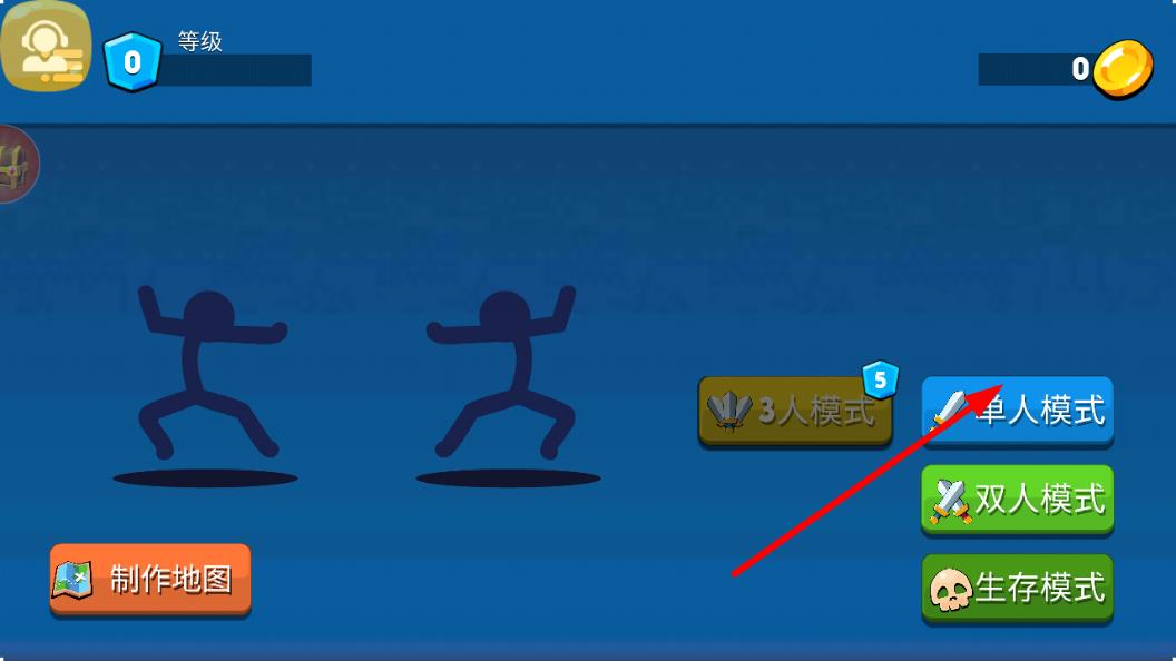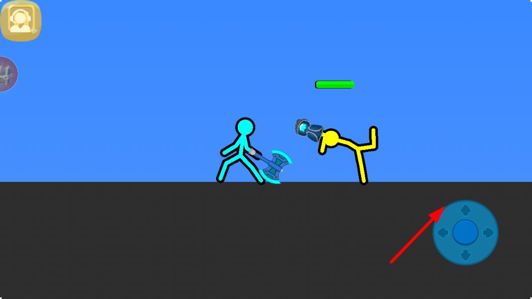 1、进入游戏后,选择初始火柴人角色,在基础擂台上熟悉操作,通过虚拟摇杆控制移动,点击攻击按钮挥舞武器,尝试将对手逼至擂台边缘并击落。