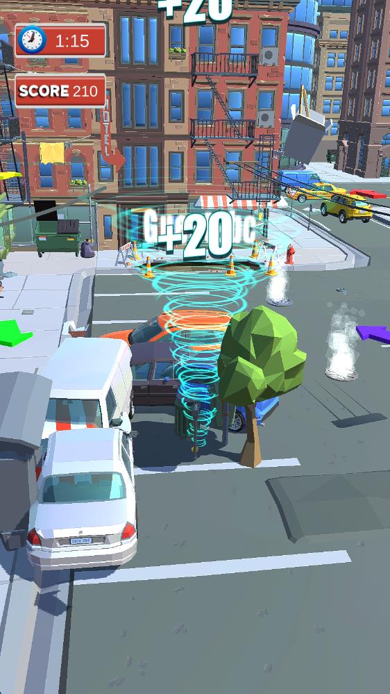 3、目标挑战:以成为最大的龙卷风为目标,在城市中不断扩张势力,通过破坏与吞噬积累优势,最终称霸整个城市,完成乱斗挑战。