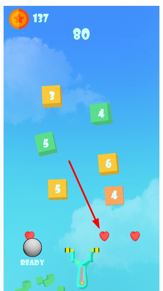 2、小球碰撞方块触发回弹,利用场景边缘、方块间隙多次反弹,扩大破块范围,爱心为能够被方块碰撞的次数。