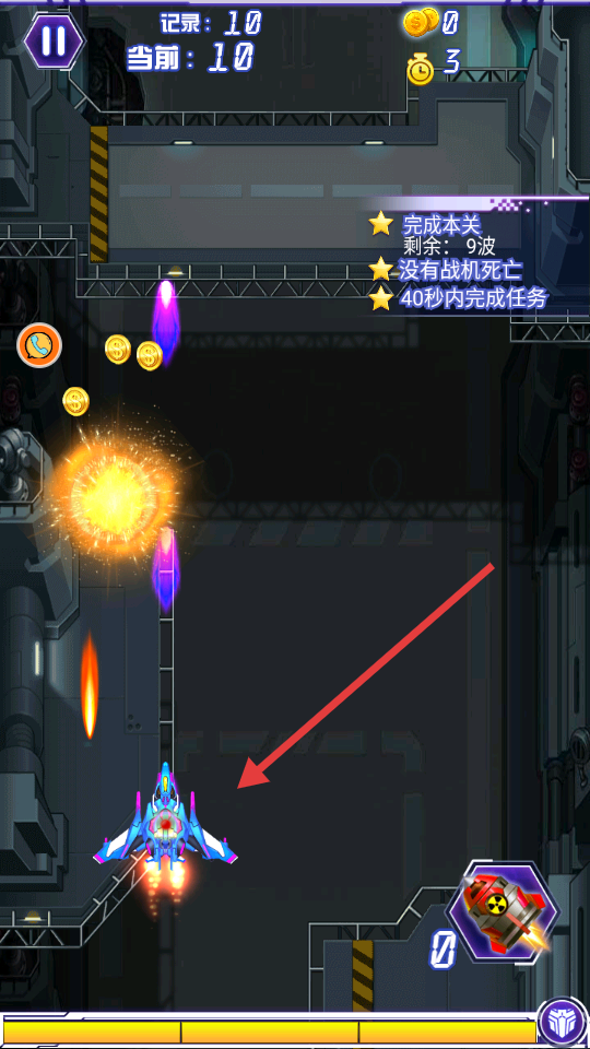 4、通关后使用金币提升战机攻击力、移动速度等基础属性。