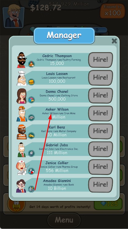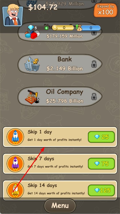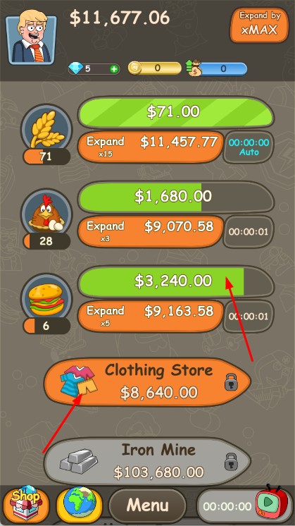 2、选择业务类型,开发产品、拓展业务,通过投资、收购扩大版图,用金币升级产业提升收益速度。
