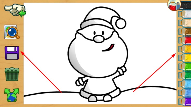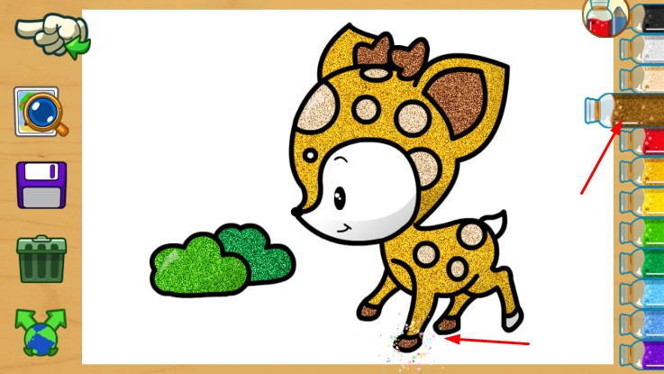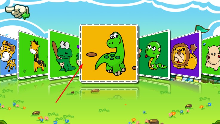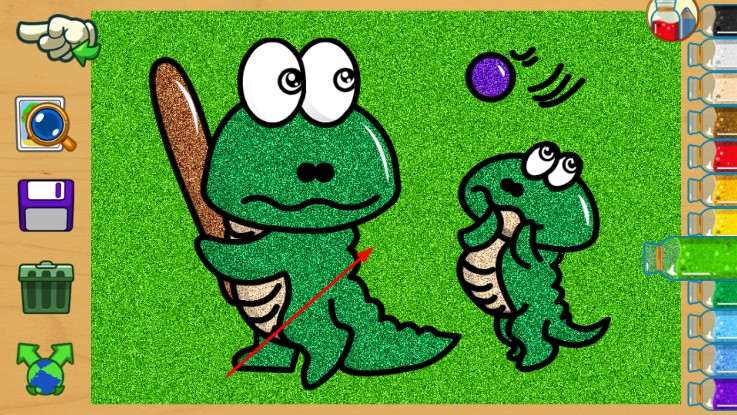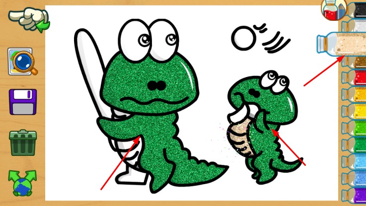 2、点击喜欢的卡通图案,在绘画界面,用右侧颜料瓶,点击恐龙身体部位上色。