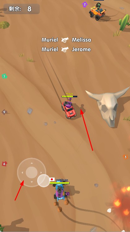 2、操控装甲车在沙漠等场景行驶,用虚拟摇杆控制方向,利用武器攻击其他玩家车辆,收集场景道具。