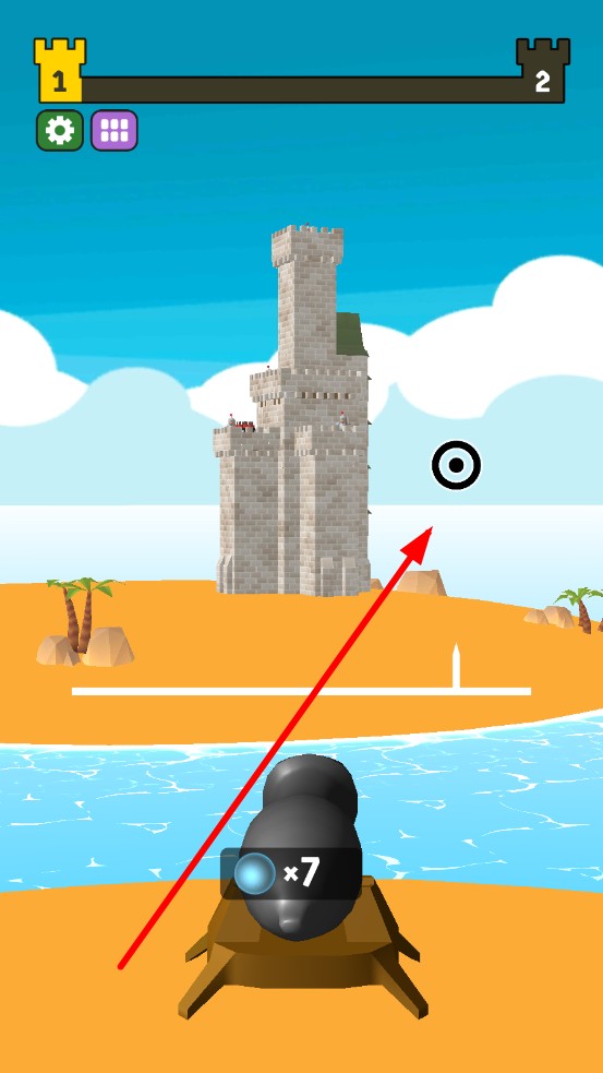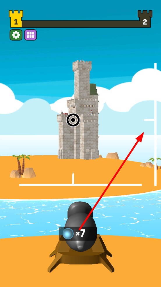 1、拖动炮台刻度盘调整射击角度,准心会左右滑动,规划滑动的时机,等到瞄准城堡塔楼底座薄弱点后,点击。