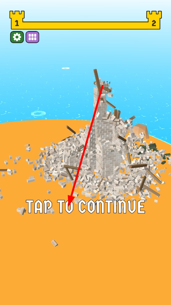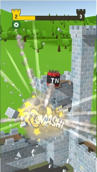 1、物理破坏机制:城堡砖块实时分层崩落,受力点不同导致倒塌方向变化,塔楼旋转倾斜、墙体呈龟裂状碎裂,甚至因失衡二次坍塌,还原物理摧毁动态反馈。