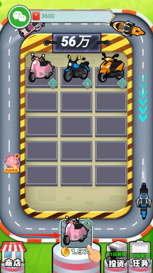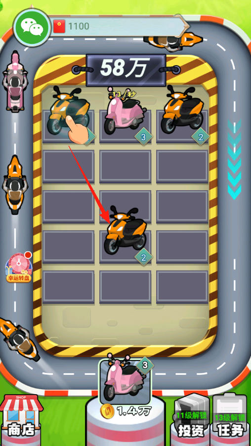 1、拖动同类型摩托车如橙色、粉色到空位,合成更高级车辆,提升收益看每秒产出。
