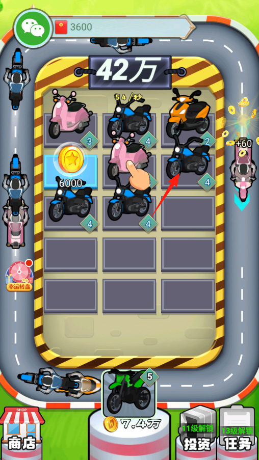 3、持续合成,让自己的车库里面满是高级摩托,增加金币产出,解锁商店,投资等功能,升级玩法。