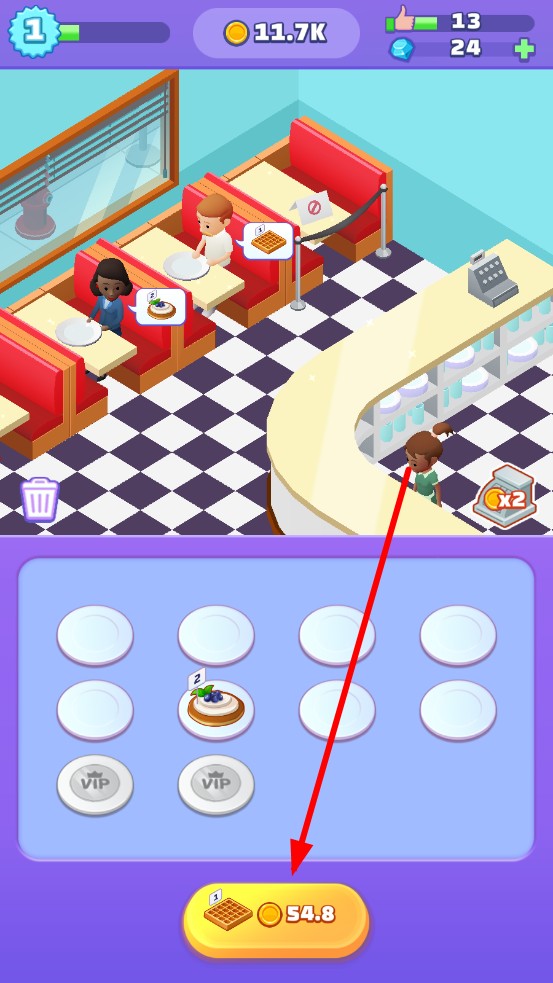 1、进入店铺,观察顾客头顶甜品需求,华夫饼、莓果蛋糕等食物,使用金币解锁,将食物递给客人。