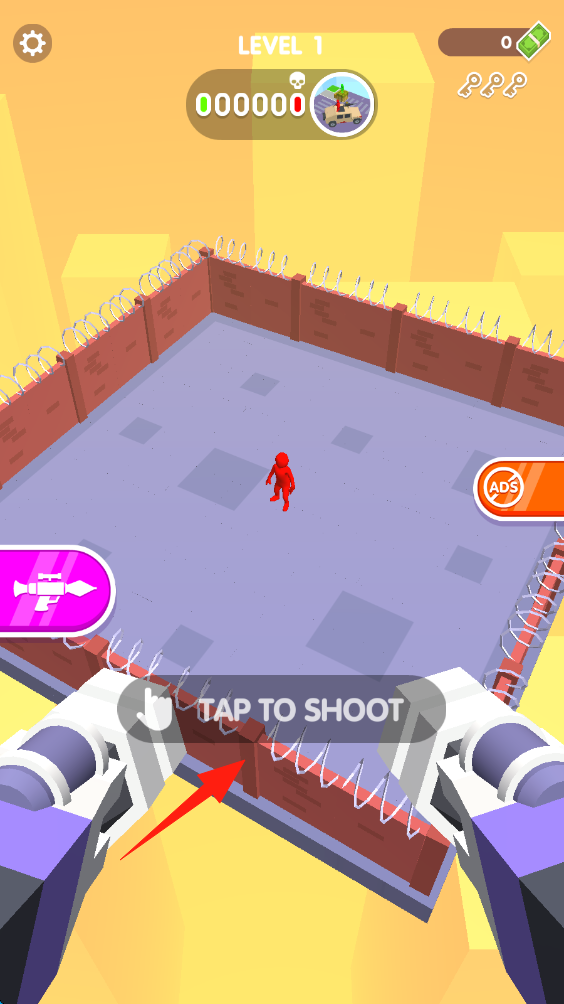 1、在Level-1关卡,点击TAP-TO-SHOOT按钮,发射武器攻击红色目标,完成关卡挑战。