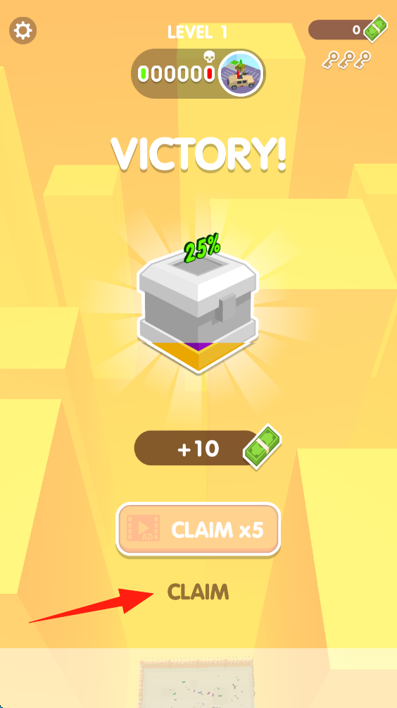 2、胜利后点击CLAIM按钮,领取10现金奖励,用于解锁新武器或升级,点击进入下一步。