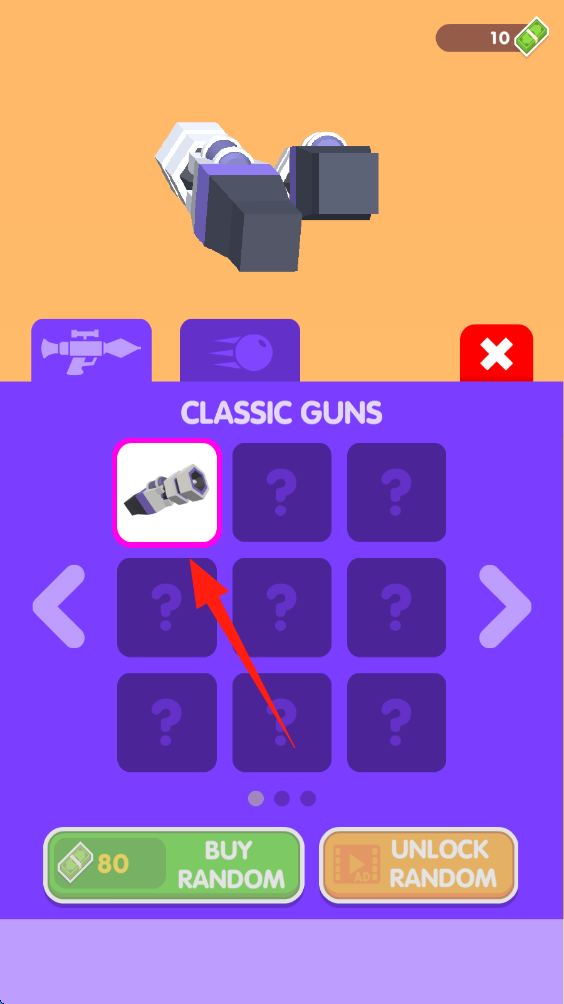 3、进入武器界面,选择已解锁的经典枪支,花费80现金购买或看广告解锁随机武器。
