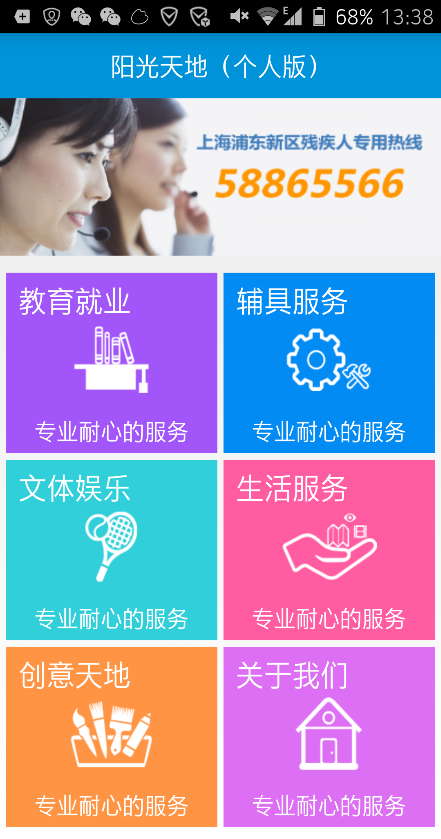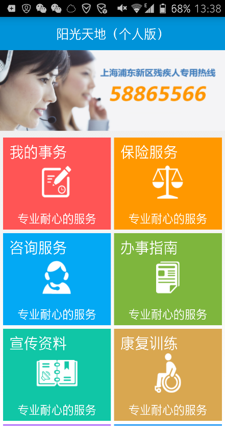 为浦东新区残疾人提供手机端的公共服务接入,主要功能包含:办事指南、保险服务、咨询服务、宣传资料、康复训练、教育就业、辅具服务、文体娱乐、生活服务等助残服务功能。