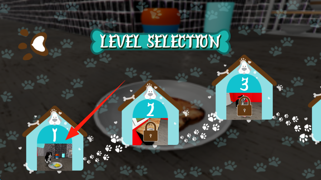 2、在关卡选择界面,点击标有1的蓝色小屋,进入第一关,开始宠物烹饪任务,点击选择关卡。