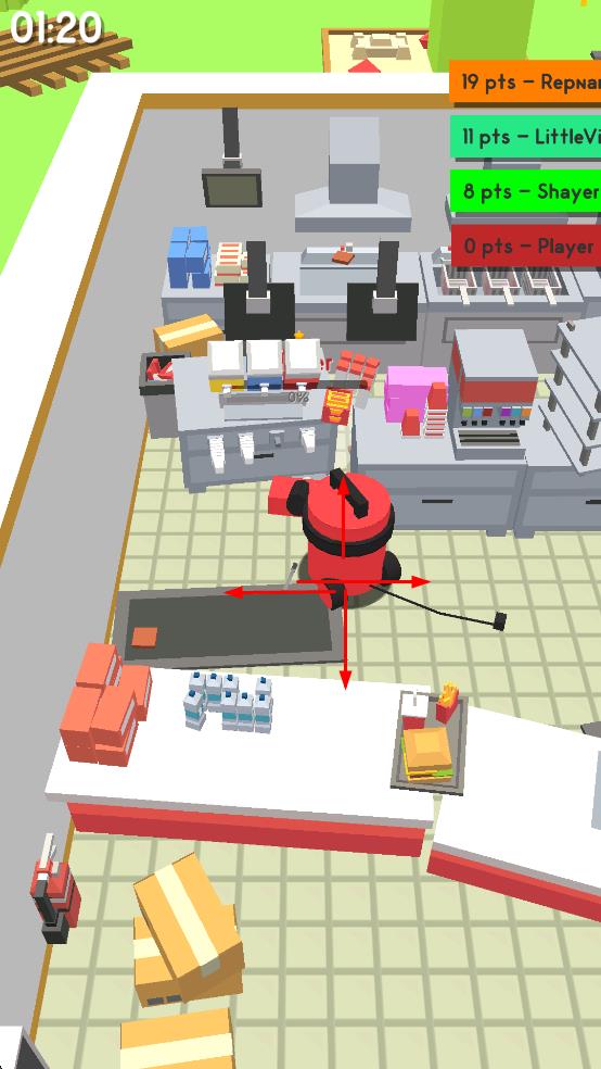 1、操控红色吸尘器在场景移动,吸附箱子、道具等物品,积累分数,开启收集之旅。
