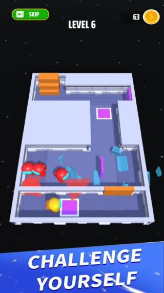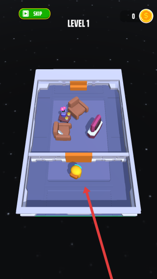 1、在Level1,滑动屏幕操控黄色角色移动,规划路径,推动家具归位,完成空间整理,达成关卡目标。