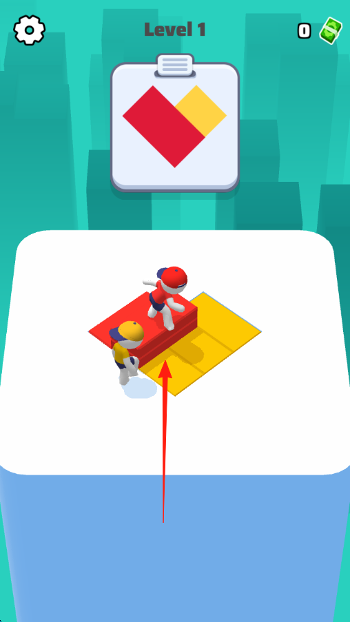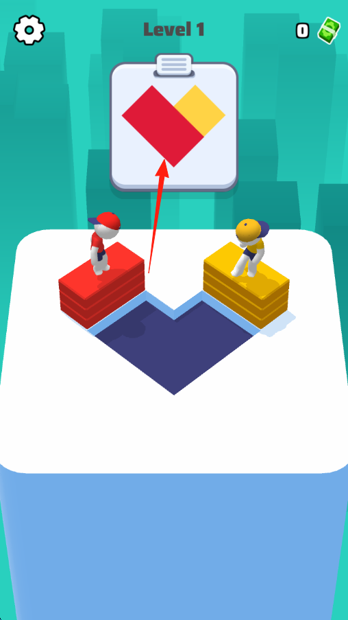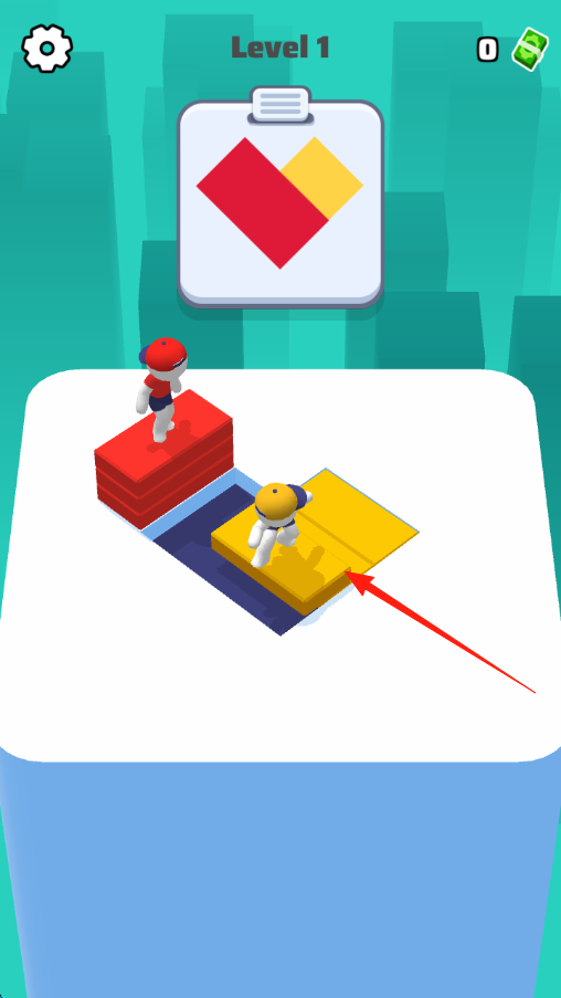 1、进入游戏Level1关卡,上方有显示目标图案的图纸指引红、黄小人,移动对应颜色方块红、黄。