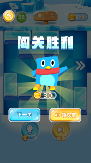 1、玩家的主要任务是帮助被困在冰窟内的企鹅逃离出去,通过滑动屏幕将挡在出口的冰块全部挪走。这是游戏的核心玩法。