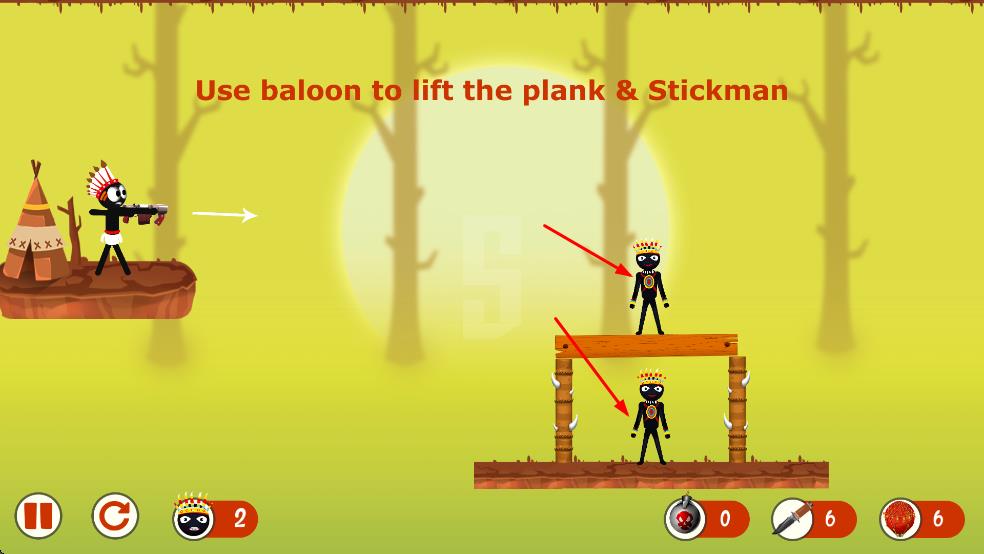3、面对平台敌人,使用气球道具,让气球抬起木板及上方火柴人,创造通关条件。