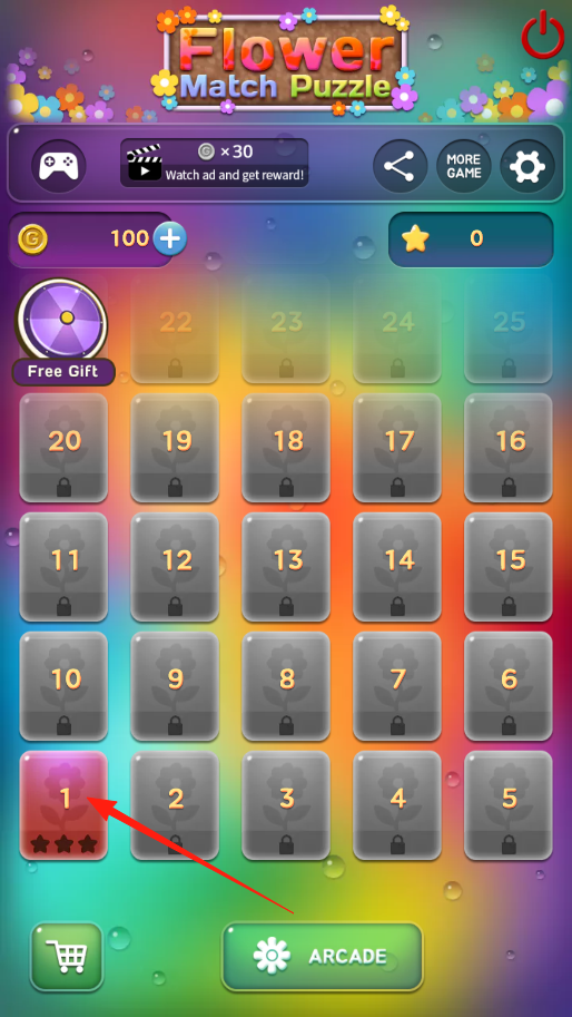 1、点击标着1的关卡按钮,就能进入第一关啦,进入后,开始在这个花朵匹配的游戏里,尝试进行花朵的匹配操作,看看能不能顺利开启游戏进程。