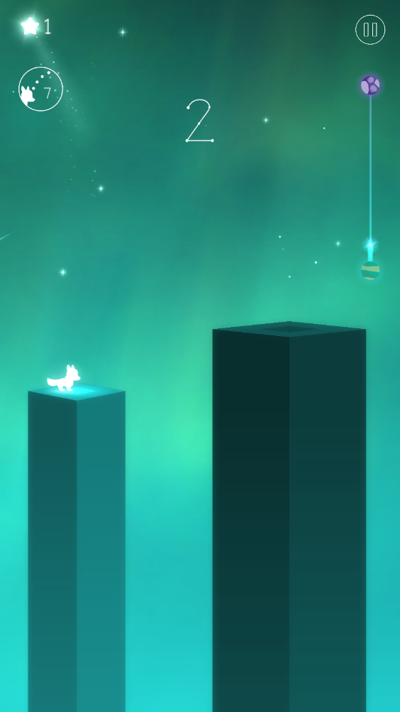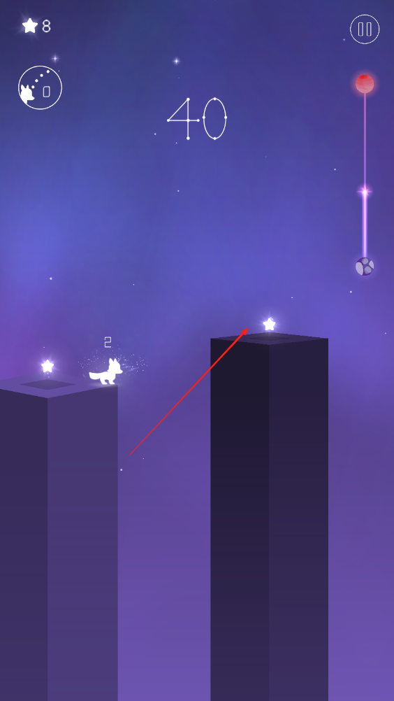 1、按照游戏提示,长按屏幕点击蓄力,松开让狐狸跳跃,跨越平台间空隙,收集星星平台中间的星星。