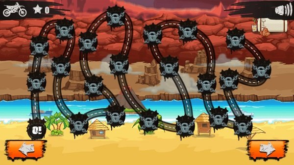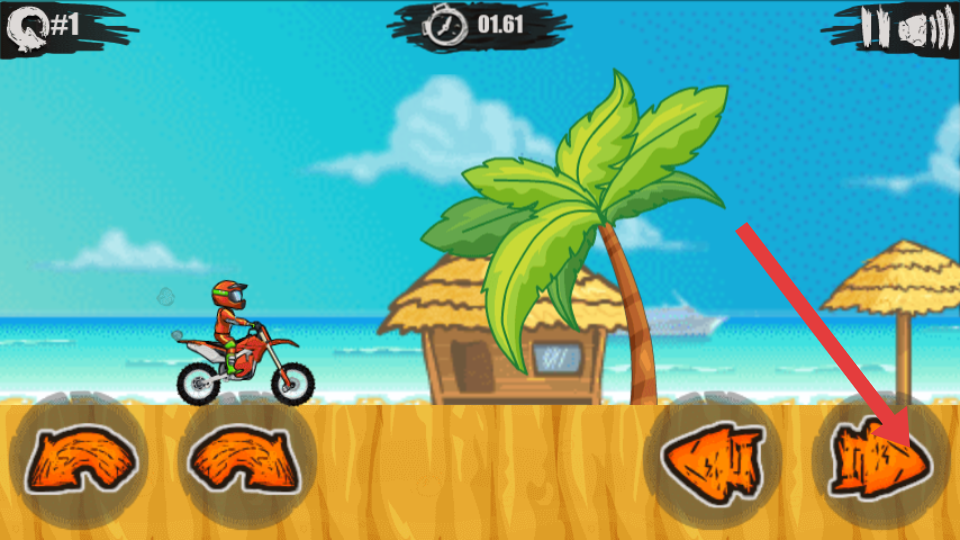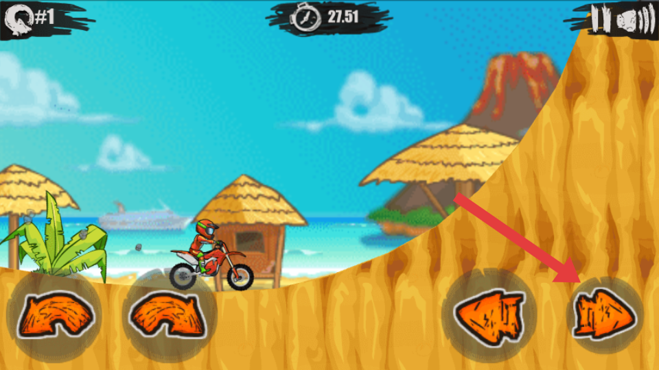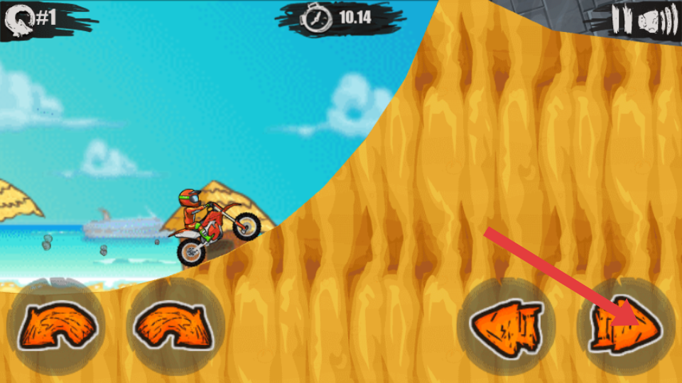 1、进入第1关,用左右箭头按键右下角控制摩托方向,遇到沙滩坡,点击左侧的跳跃按钮橙色弧形。
