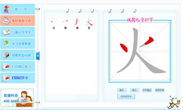 课程设有动画学习、笔顺笔画学习、在线描红练习、打印出描红册实体练习、识字卡5大部分,家长或者老师可以根据孩子的具体情况进行安排。