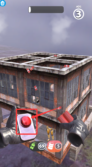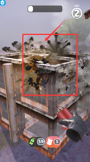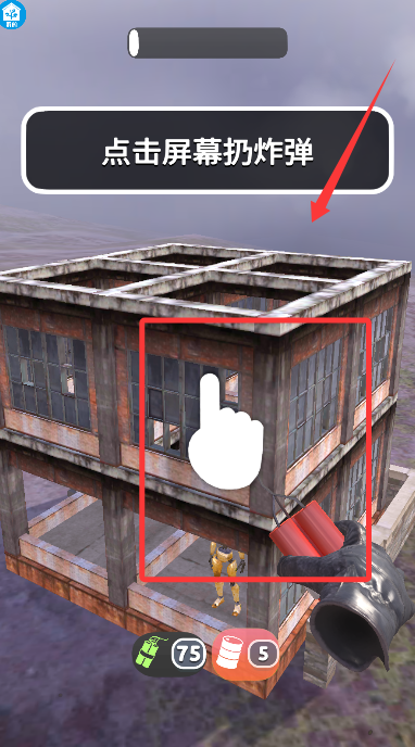 1、游戏开始后,根据指引点击屏幕,将爆破物投向指定建筑物。