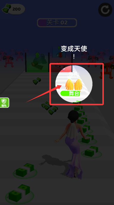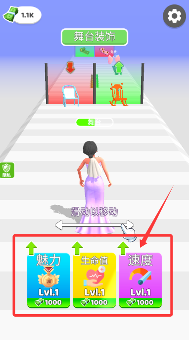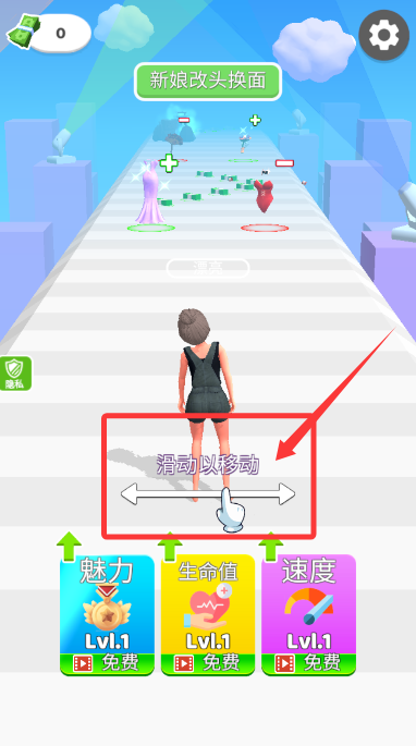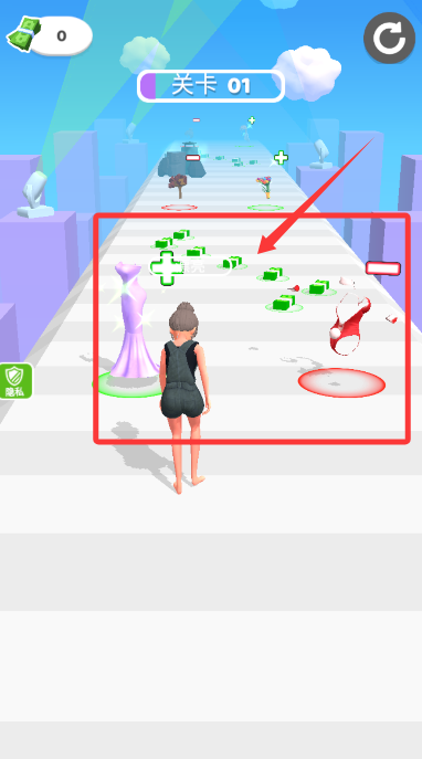2、沿途拾取金币等资源,并触碰服装道具为角色更换时尚造型。