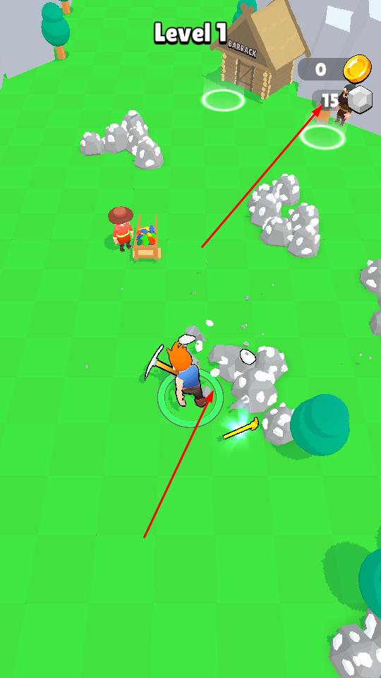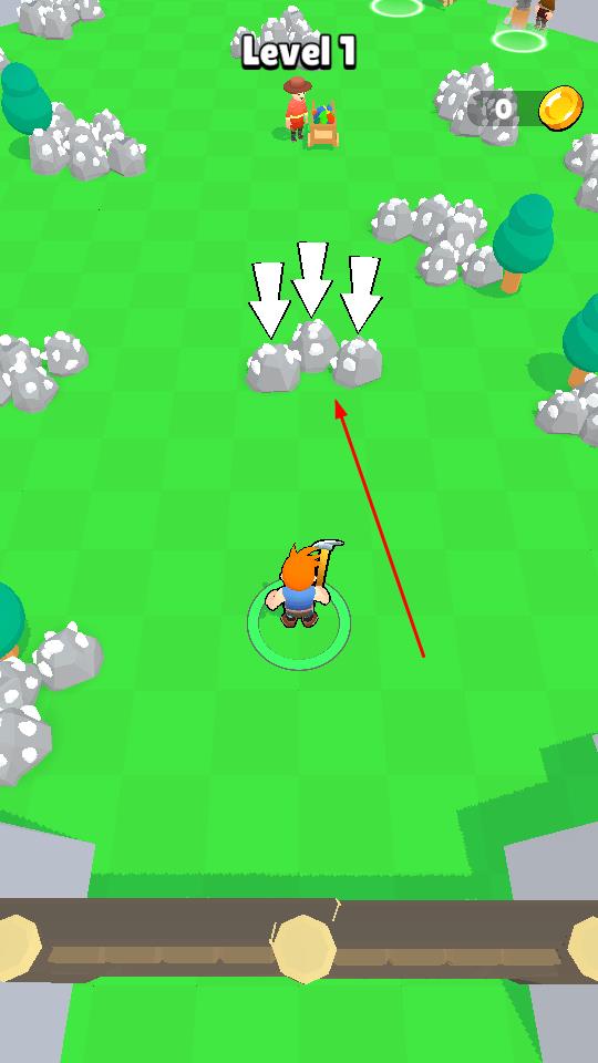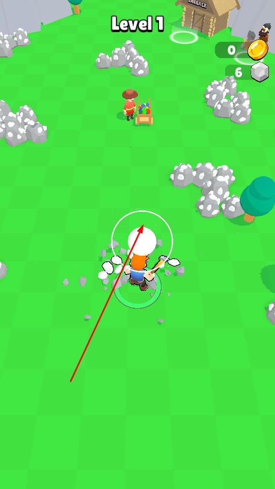 1、进入Level1界面后,靠近箭头指向的石块区域,挥动工具采集石块,开启资源收集流程。