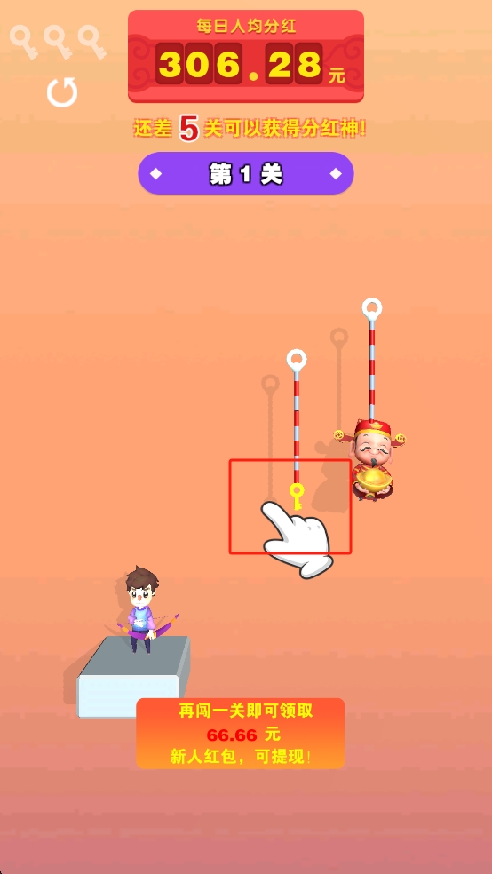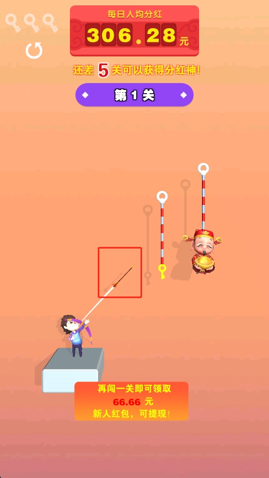 2、操作人物拉弓,调整射箭角度,让箭射中钥匙,箭射出后,钥匙所在杆掉落,财神随杆降下,完成关卡条件。