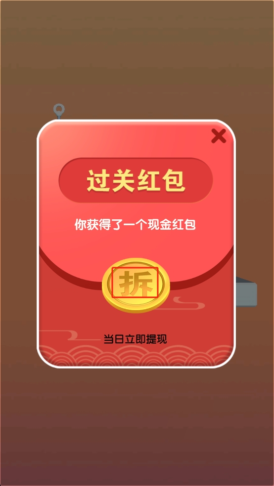 3、成功解救财神爷后,弹出过关红包界面,显示获现金红包,点击拆字领取红包,之后就可以进入下一关。
