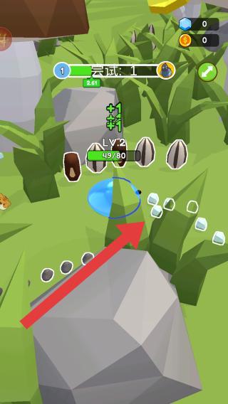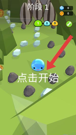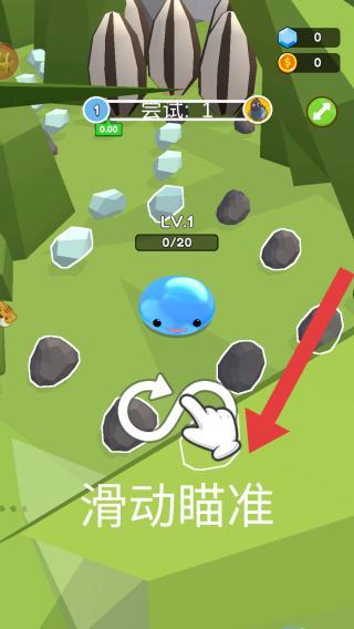 2、显示果冻角色的等级为1,处于新手教程指引的页面,玩家需要通过滑动进行瞄准移动该角色。