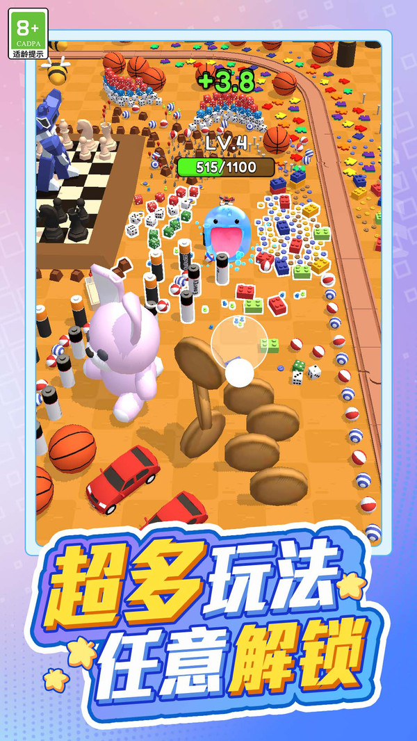 3、果冻角色位于充满道具与障碍的地图中,通过虚拟摇杆灵活操控移动,收集物品并持续提升角色体型与等级。
