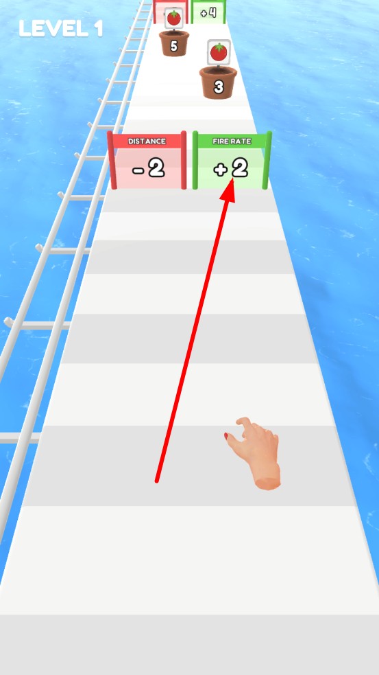1、关卡启动,角色在水上跑道开跑,优先经过绿色增益门,绿门增益浇水效率或花盆数量,红门减益慎选;带番茄图标的花盆种下种子。