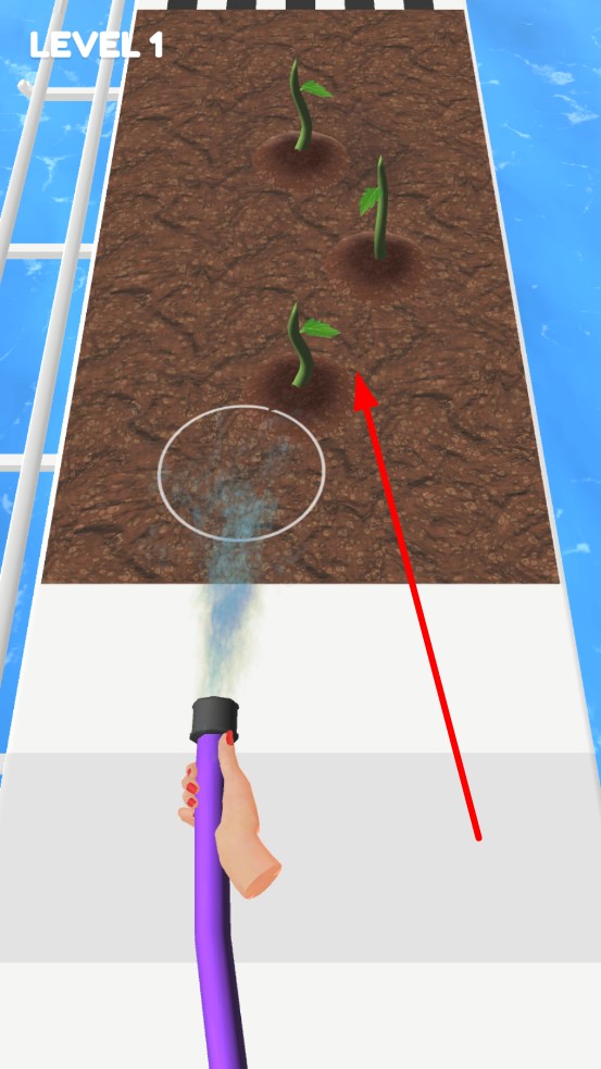 2、进入棕褐泥土的种植区,三根幼苗露头,按住紫色水管滑动,水流浇淋让幼苗疯长,尽量将 每个苗都浇水到百分百。