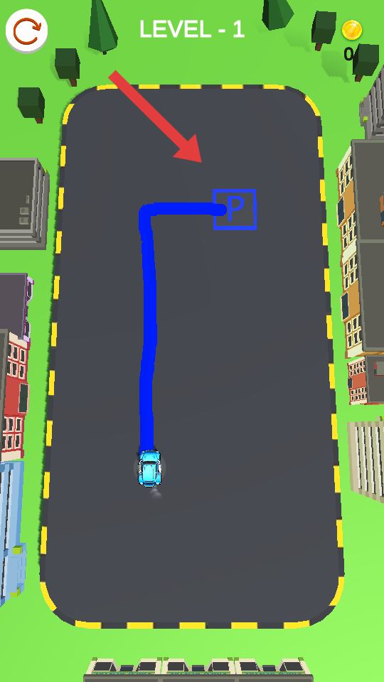 1、在LEVEL-1的关卡,我们需要规划好去停车的路径,让车辆按照画好的线路行驶,精准驶入目标停车区域P标识处。