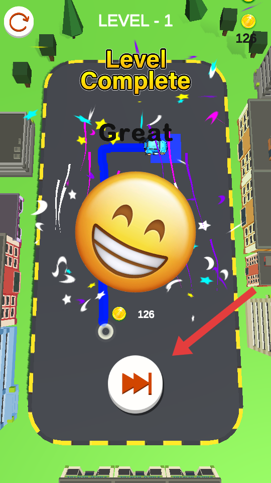 2、关卡完成后,游戏的界面显示Level Complete,需要点击箭头标注的橙色播放按钮,进入下一关挑战。