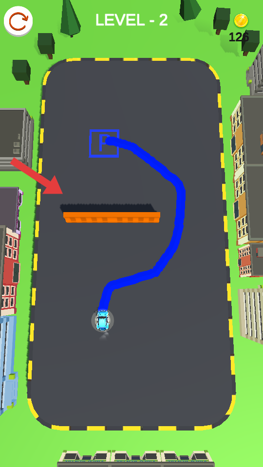 3、进入LEVEL-的2关卡,沿着我们画好的蓝色路径行驶,在规划路劲时需要避让橙色障碍物,顺利抵达车位。
