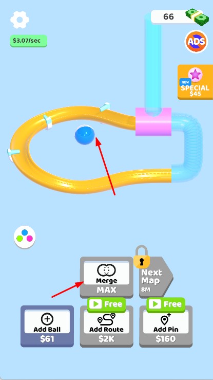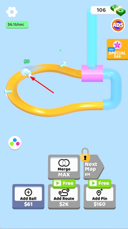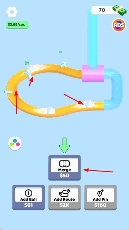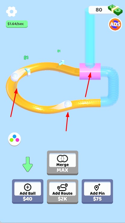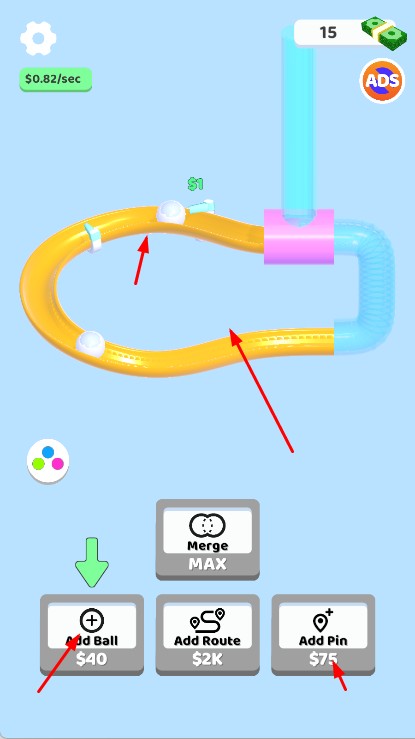 1、进入游戏,弹珠沿管道循环滚动,点击Add Ball花费金币增加弹珠数量,让更多弹珠在管道运行。