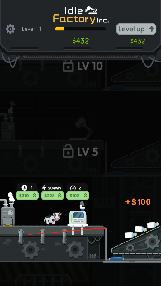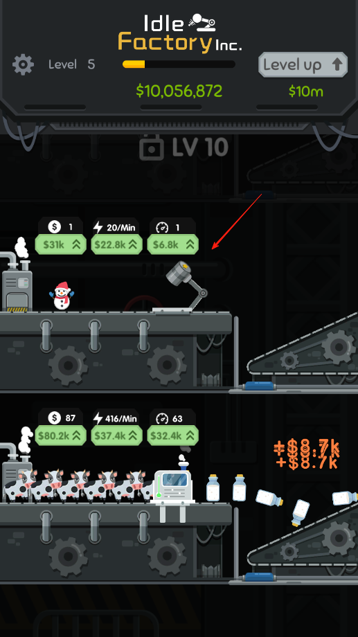 1、滑动屏幕可以让传送快速将奶牛丢进机器变成牛奶,点击工厂设备旁的绿色升级按钮,提升奶牛、机器等生产单元的效率
