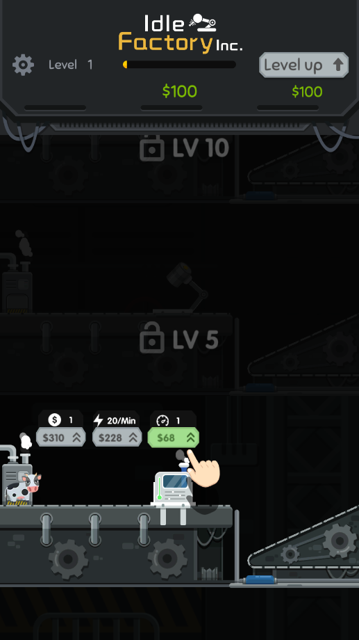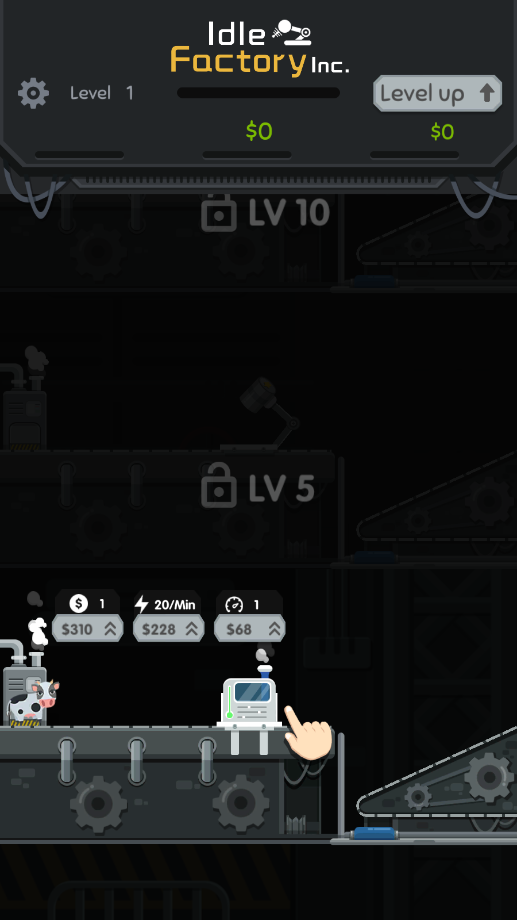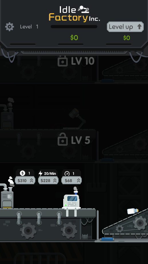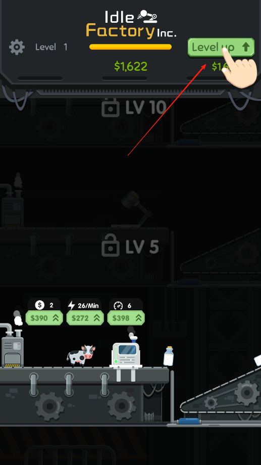 2、当上方经验条满后,点击Level up按钮升级工厂的等级,解锁新的设备、新的区域,拓展生产规模。