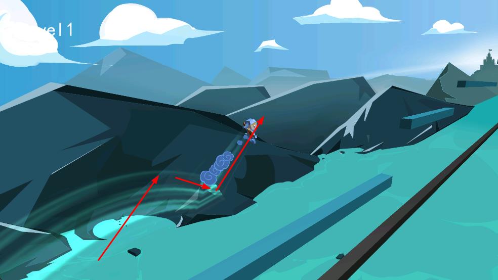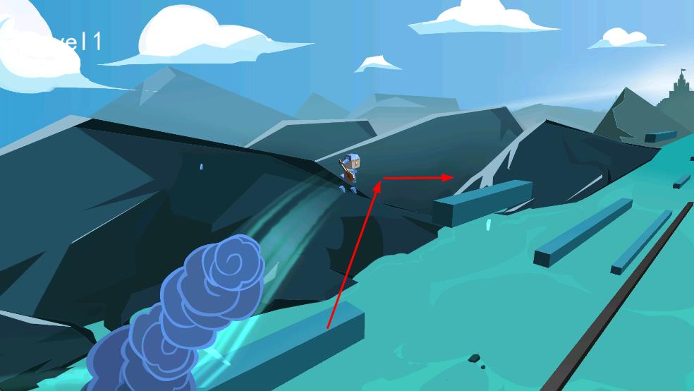 1、进入Level1关卡,操控角色在地形移动,躲避蓝色旋风。