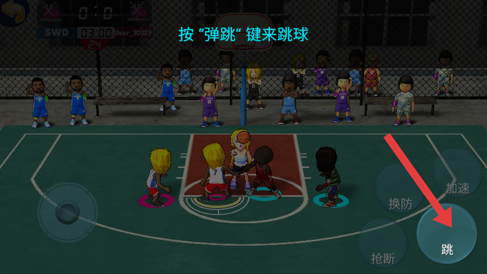 1、开场按提示按‘弹跳键跳球,控制己方球员黄发等,点击右侧跳键争夺球权,优先让内线球员篮下参与。