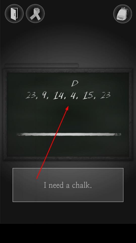 2、观察黑板数字23,9,14,4,15,23,按字母表顺序对应A=1,换算得W,I,N,D,O,W,结合下方I need a chalk提示,寻找粉笔道具破解谜题。