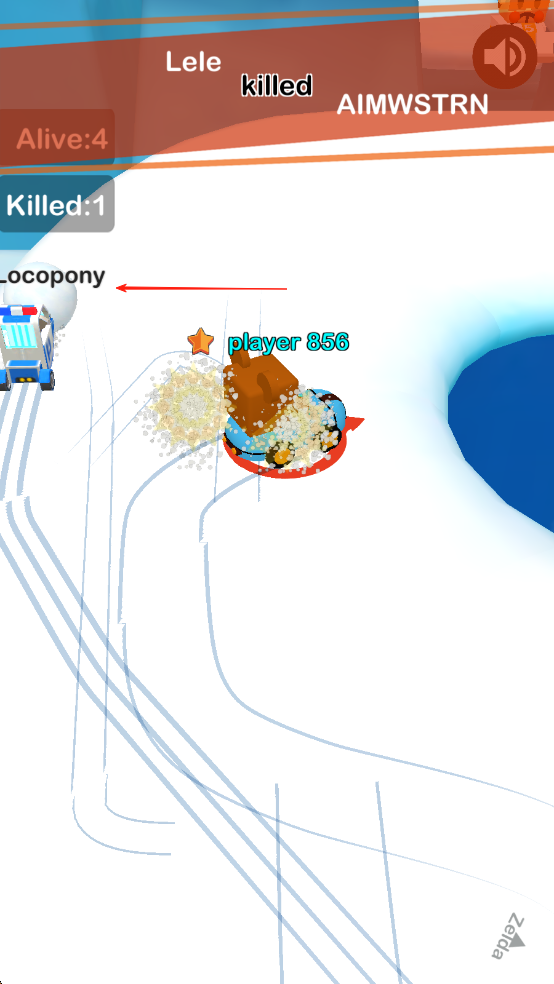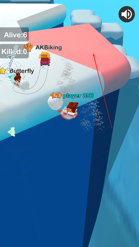3、存活玩家减少,关注上方存活数和击杀数,不断撞击雪球壮大自身威胁,还要注意场地上每隔一段时间就会有一块区域会消失。