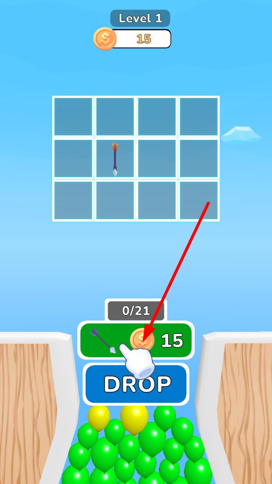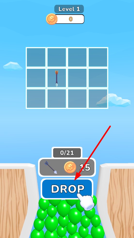 1、进入关卡,上方网格陈列箭头、炸弹等初始道具,点击网格选道具,或耗金币点绿按钮换更强道具,确定后按蓝DROP,弓箭从网格坠落。