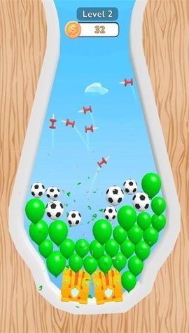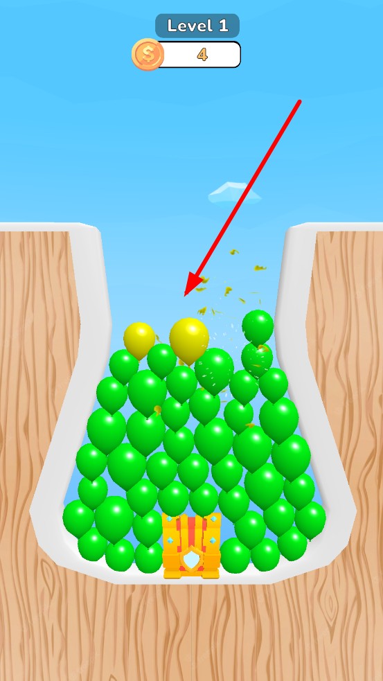 3、宝箱惊喜:底部宝箱被气球盖着,戳破最上层中间的黄球等特定位置,能提前解锁宝箱,爆出金币瀑布。似在气球堆挖财富密码,重玩就为找宝箱触发点,惊喜感直接拉满。