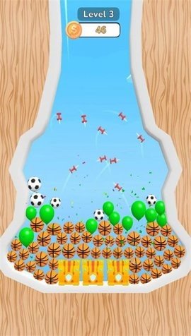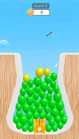 2、道具下落受重力弹跳,箭头戳破气球后弹向四周,连锁戳破更多,绿气球经多次撞击才爆开,收集气球爆的金币。